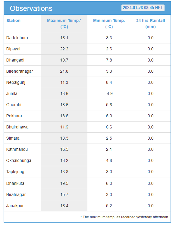 मौसम पूर्वानुमान महाशाखाका अनुसार यही समयमा जुम्लाको न्यूनतम तापक्रम माइनस ४.९ डिग्री सेल्सियस, नेपालगन्जको ८.४ डिग्री सेल्सियस र पोखराको तापक्रम ६ डिग्री सेल्सियस मापन गरिएको छ ।