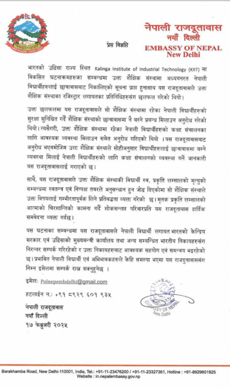 दूतावासले सोमबार जारी गरेको विज्ञप्तिमा विश्वविद्यालय प्रशासनसँग छलफल गरी नेपाली विद्यार्थीको सुरक्षाको प्रत्याभूति गर्दै उनीहरूलाई पुनः छात्रावासमा आवासीय सुविधा दिन र कक्षा सञ्चालन गर्न आग्रह गरिएको उल्लेख छ।