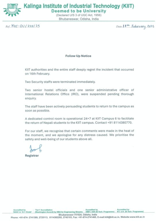 केआइआइटीले आज एक विज्ञप्ति जारी गर्दैै घटनालाई गम्भीर रुपमा लिएको जनाउँदै माफी मागेको हो । उसले गहिरो दुख व्यक्त गर्दै नेपाली विद्यार्थीलाई अभद्र व्यवहार गर्ने दुई जना सुरक्षा गार्डलाई सेवाबाट हटाइएको र तीन जना निलम्बित भएको जनाएको छ ।